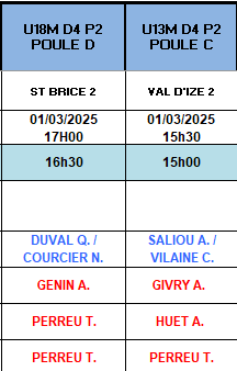 Horaires des entrainements 2025-2026