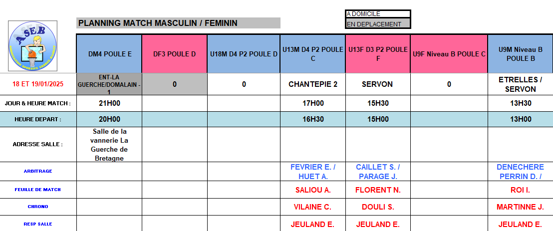 Planning du 18 et 19 Janvier 2025