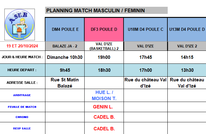 Planning du 19 et 20 Octobre 2024