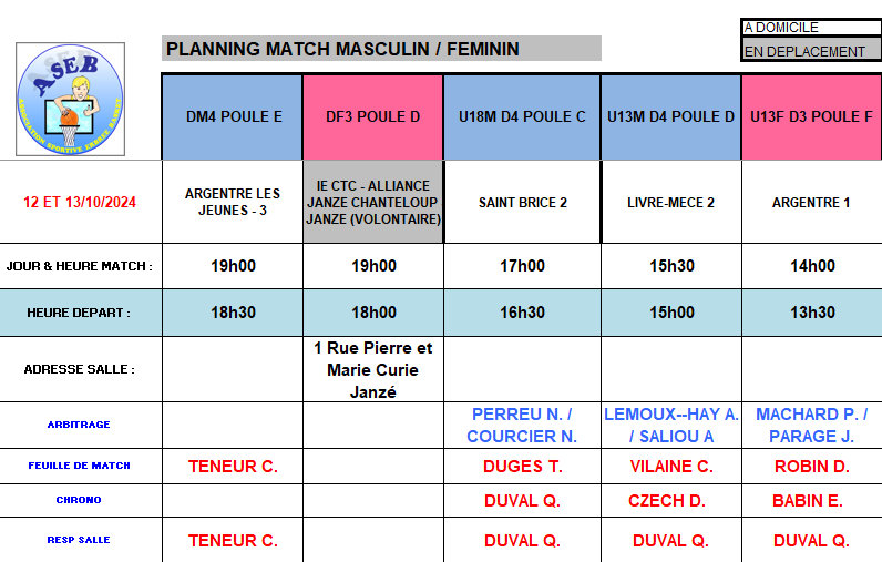 Planning du 12 et 13 Octobre 2024
