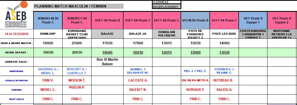 Planning des matchs du 14 et 15 décembre 2019