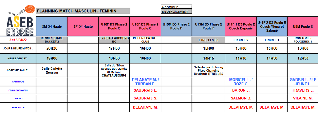 Planning du 2 et 3 Avril 2022