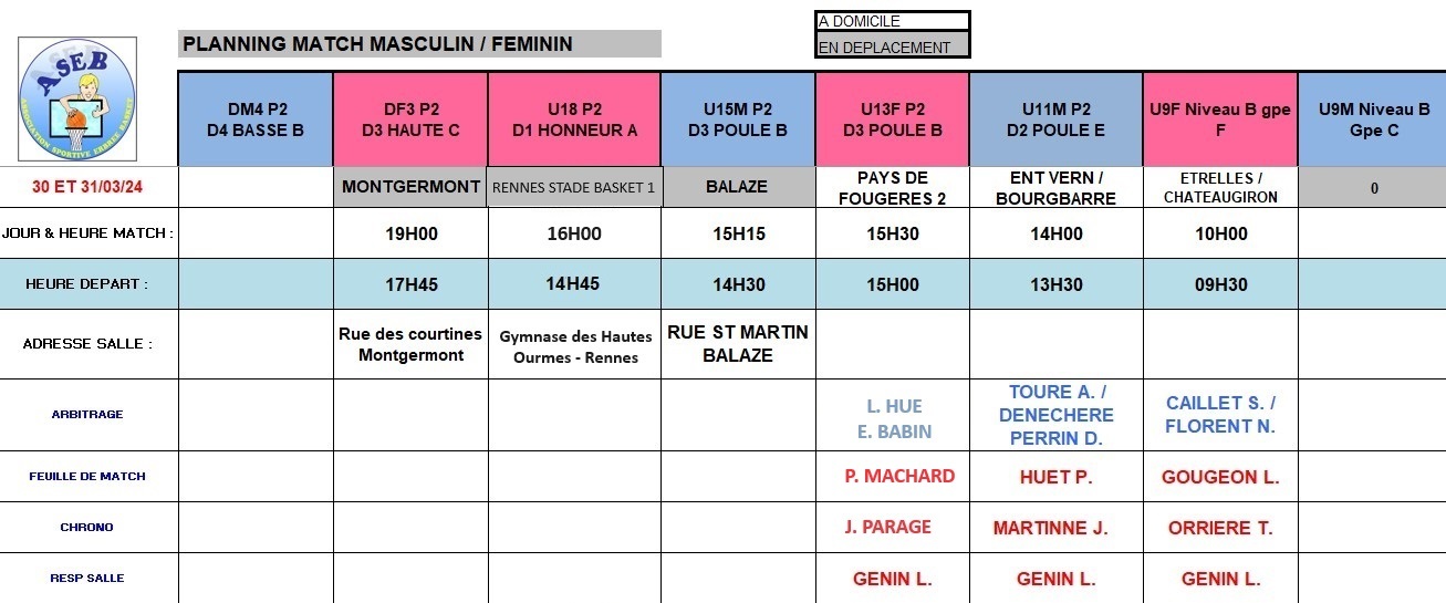 Planning du 30 et 31 Mars 2024